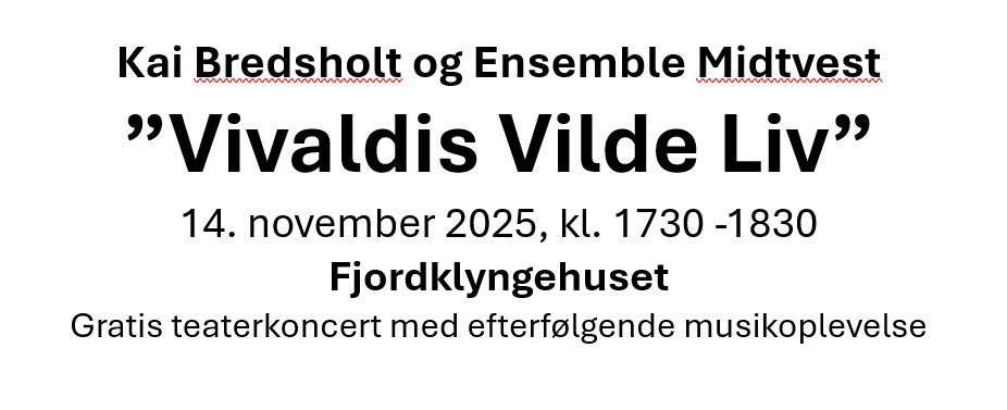 Fredag den 14. november 2025 kl. 1730 - 1830 opfører Kai Bredsholt fra Landsby Laboratoriet og 4 klassiske musikere fra Ensemble Midtvest forestillingen "Vivaldis Vilde Liv" i Fjordklyngehuset. Forestillingen er sponsoreret af Viborg Kommune, så det er gratis at overvære forestillingen.