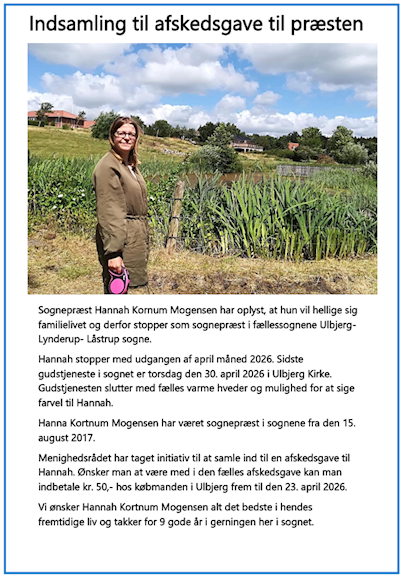 Indsamling til afskedsgave til sognepræst Hannah Kortnum Mogensen