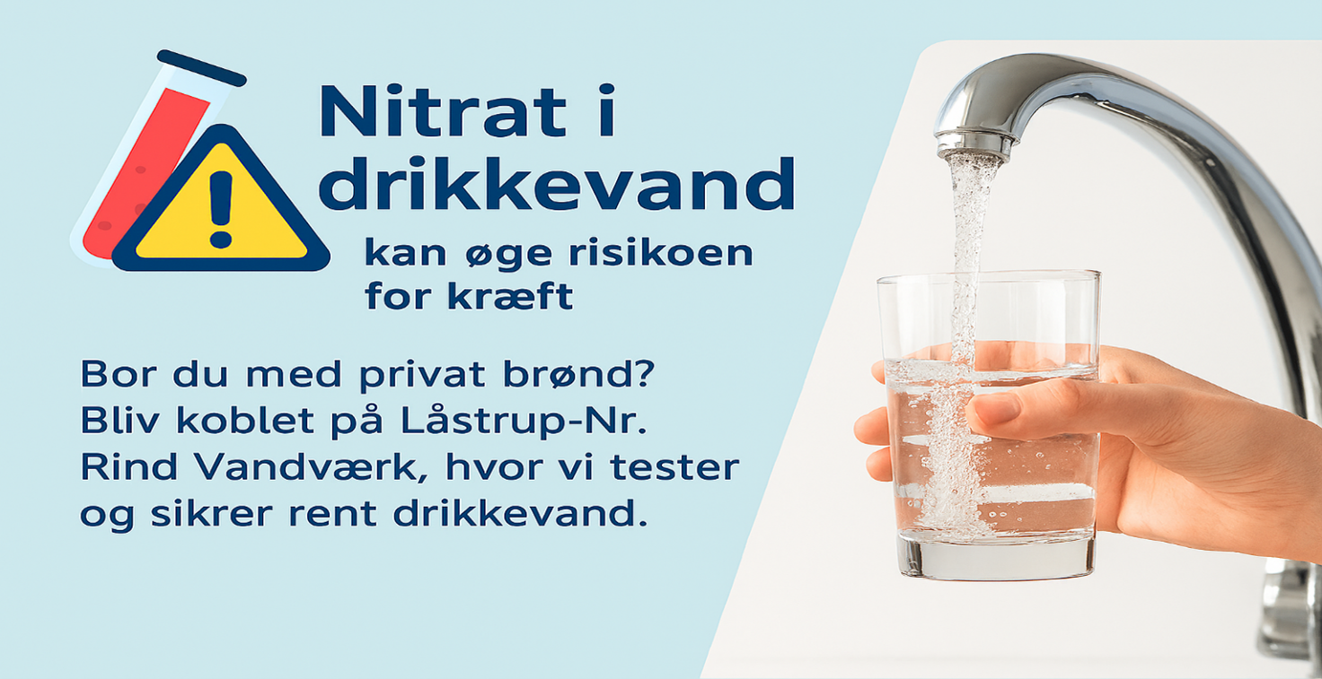 Mange private boringer i Låstrup-Nr.Rind Vandværks forsyningsområde har et højt indhold af nitrat. Ny forskning viser, at nitrat i drikkevand kan være skadeligt for helbredet helt ned til 10 mg. pr. liter vand. Låstrup-Nr. Rind Vandværk leverer drikkevand med lavt nitratindhold og tester jævnligt for bakterier, pesticider og andre usunde stoffer. Se info på vores hjemmeside.