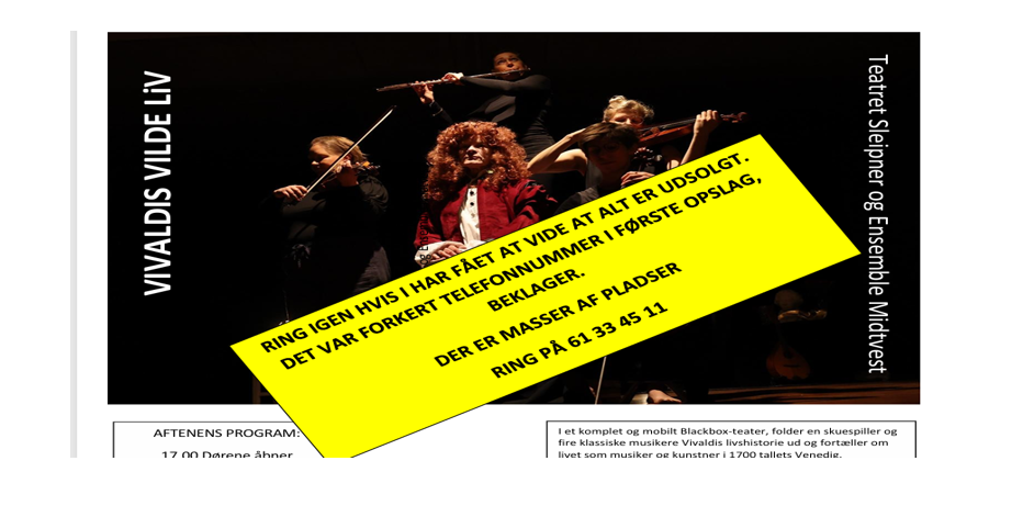 Ring igen hvis du har fået oplyst, at der er udsolgt. I tidligere info er oplyst forkert telefonnummer. Der er masser af pladser til forestillingen.