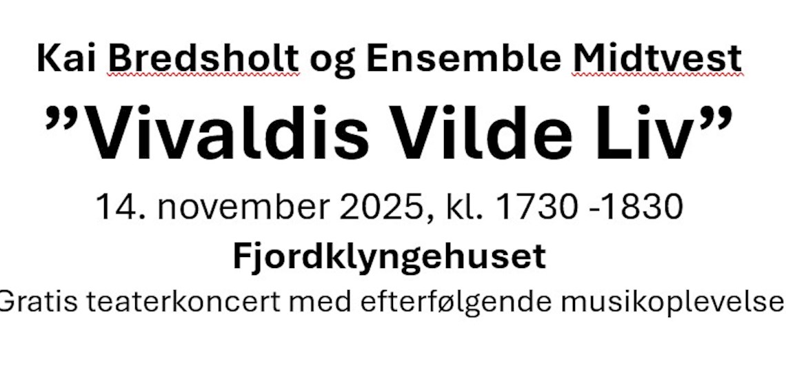 Fredag den 14. november 2025 kl. 1730 - 1830 opfører Kai Bredsholt fra Landsby Laboratoriet og 4 klassiske musikere fra Ensemble Midtvest forestillingen "Vivaldis Vilde Liv" i Fjordklyngehuset. Forestillingen er sponsoreret af Viborg Kommune, så det er gratis at overvære forestillingen.