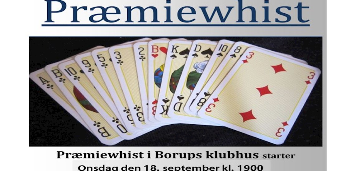 Onsdag den 18. september starter vinterens præmiewhist igen i Borup Idrætsforenings klubhus i Låstrup. Se opslag på vores hjemmeside.