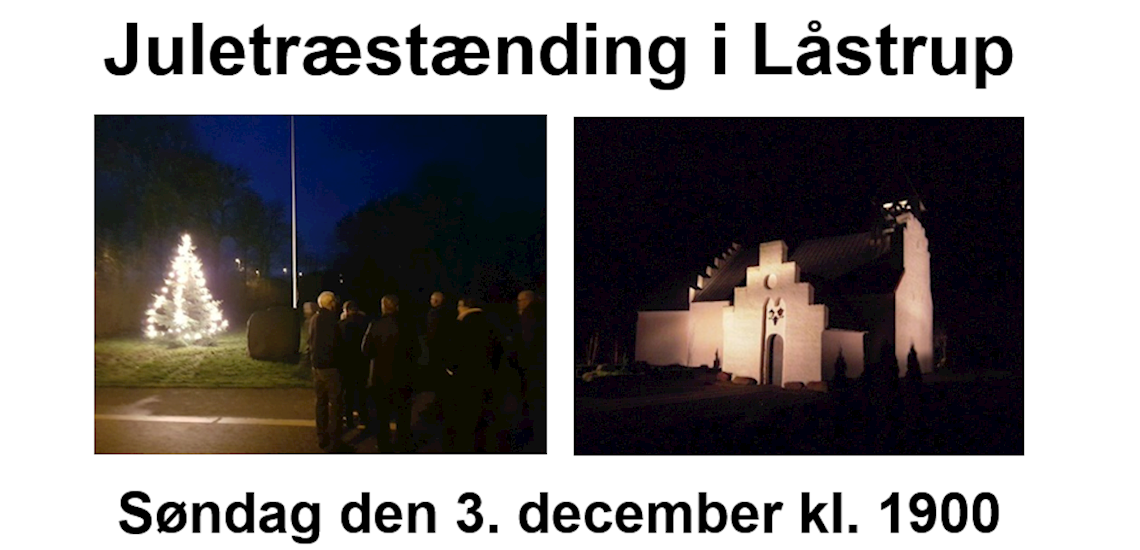 Første søndag i advent er i dag den 3. december, hvor Låstrup traditionen tro tænder lys i juletræet i Enghaven efter gudstjeneste i Låstrup Kirke kl. 1900. Der er gløgg og æbleskiver i våbenhuset efter juletræstændingen. Se opslag på vores hjemmeside.