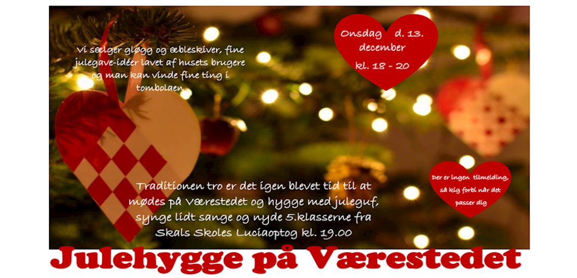 Onsdag den 13. december er der traditionen tro Lucia-optog og julehygge på Kulturcenter Værestedet i Låstrup. Fjordklyngens Skole 5. klasse går Lucia-optog. Husets brugere sælger ud af deres håndværk, og der kan købes gløgg og Æbleskiver. Ingen tilmelding kik forbi mellem 18 og 20.