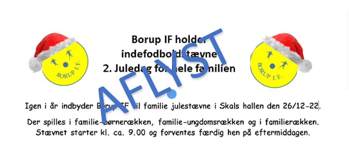 Efter tilmeldingsfristens udløb har det desværre ikke været muligt at danne puljer nok til at lave en ordentlig fodboldturnering. Bestyrelsen har derfor besluttet at aflyse julens fodboldstævne for hele familien i Skals Hallen 2. juledag.