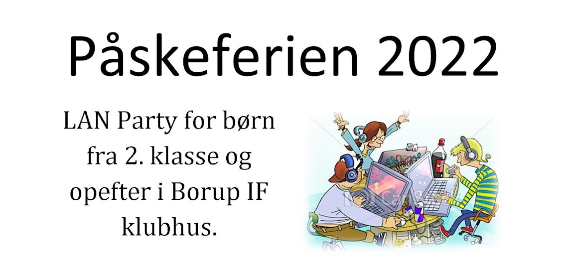 Borup Idrætsforening holder LAN party i hverdagene i påskeferien. Arrangementet er aldersopdelt i 2 grupper fra 2. klasse op opefter. Se opslag på vores hjemmeside.