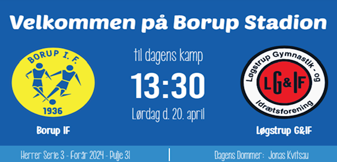 Lørdag den 20. april 2024 kl. 1330 spiller Borup IF serie 2 herre hjemme mod Løgstrup G&IF. Se kampprogrammet på vores hjemmeside nu.