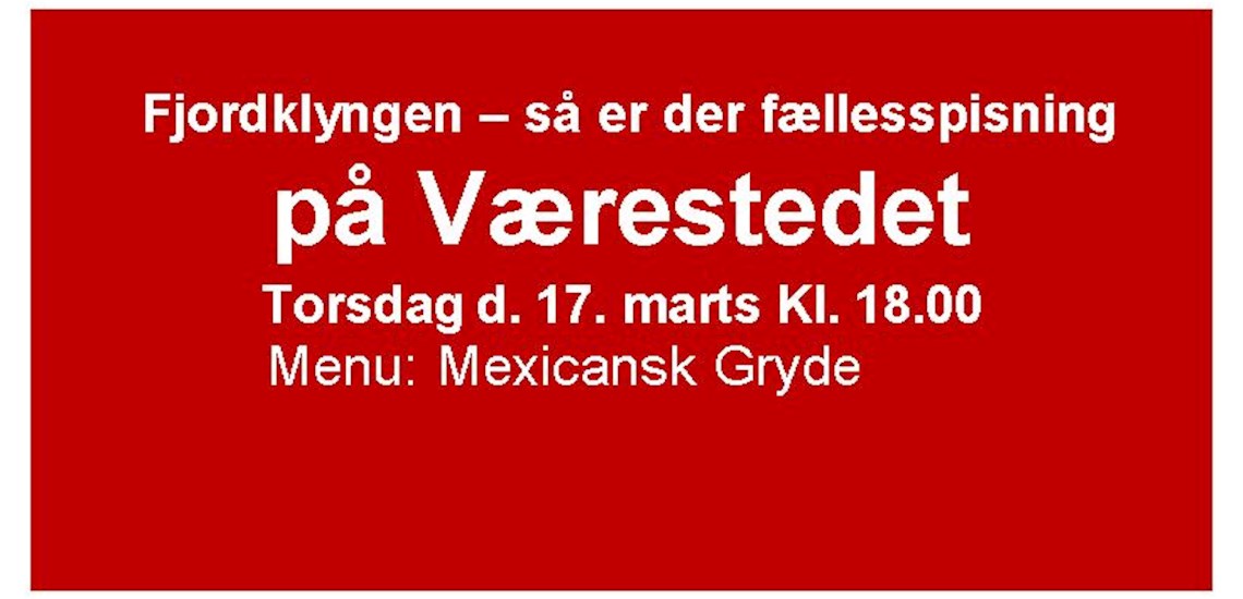 Fællesspisning torsdag den 17. marts kl. 1800 med efterfølgende generalforsamling kl. 1900. Kom og støt Kulturcenter Værestedets vej mod Hele Fjordklyngens Nye Mødested. Tilmelding til fællesspisning senest tirsdag den 15. marts kl. 1400.