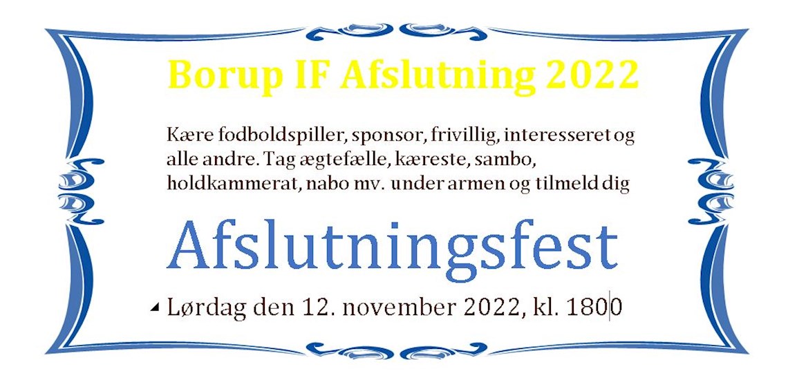 Kære fodboldspiller, sponsor, frivillig, interesseret og alle andre. Tag ægtefælle, kæreste, sambo, holdkammerat, nabo mv. under armen og tilmeld dig Borup IF afslutningsfest i Låstrup Forsamlingshus. Se opslag på vores hjemmeside.