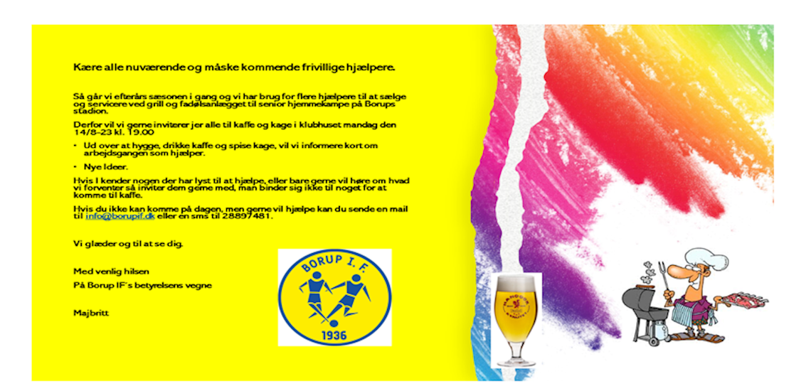 Efterårssæsonen står for døren i Borup IF. Til alle hjemmekampe laver vi åben kantine med grillpølser og ølsalg. Derfor er der brug for frivillige hjælpere til disse opgaver. Bliv selv hjælper i klubben. Alle kan være med.