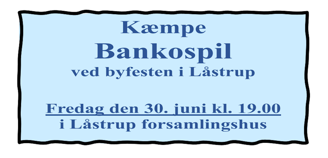 Fredag den 30. juni 2022, kl. 1900 afholdes kæmpe bankospil i Låstrup Forsamlingshus i forbindelse med byfesten i Låstrup. Se opslag på vores hjemmeside.