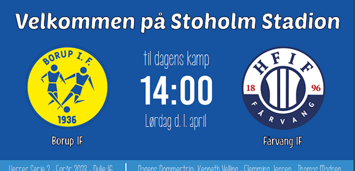 Borup IF byder i dag kl. 1400 gæsterne fra Faarvang velkommen på "hjemmebane" i Stoholm. Vores egen bane er ikke klar på grund af regn, men vi håber, at rigtig mange hjemmebanetilskuere vil tage turen til Stoholm og støtte drengene. Se kampprogram på vores hjemmeside.